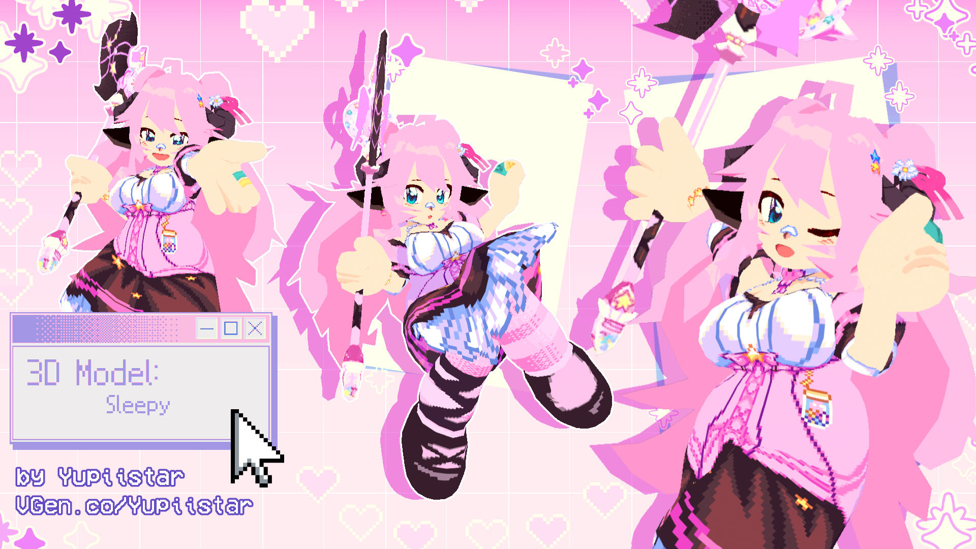 Yupii Hunie is my VTuber ! Her name is just my online username/nickname + my irl nickname but spelled differently.She is sort of a sona but does have a little bit of quickly thrown together lore: She's an washed-up aspiring magical girl in her late 20s-early 30s who's trying to awaken her dormant power via streams.Her power is a mystery but with the presence of an alternate dimension version herself in which Yupii becomes a villainness & an immortal witch might provide hints what her dormant power is.There's a "yakuza insert" version of her that just bumps her age by 10 years and has slightly adjusted lore but she looks and acts exactly the same otherwise.Check out my streams here: